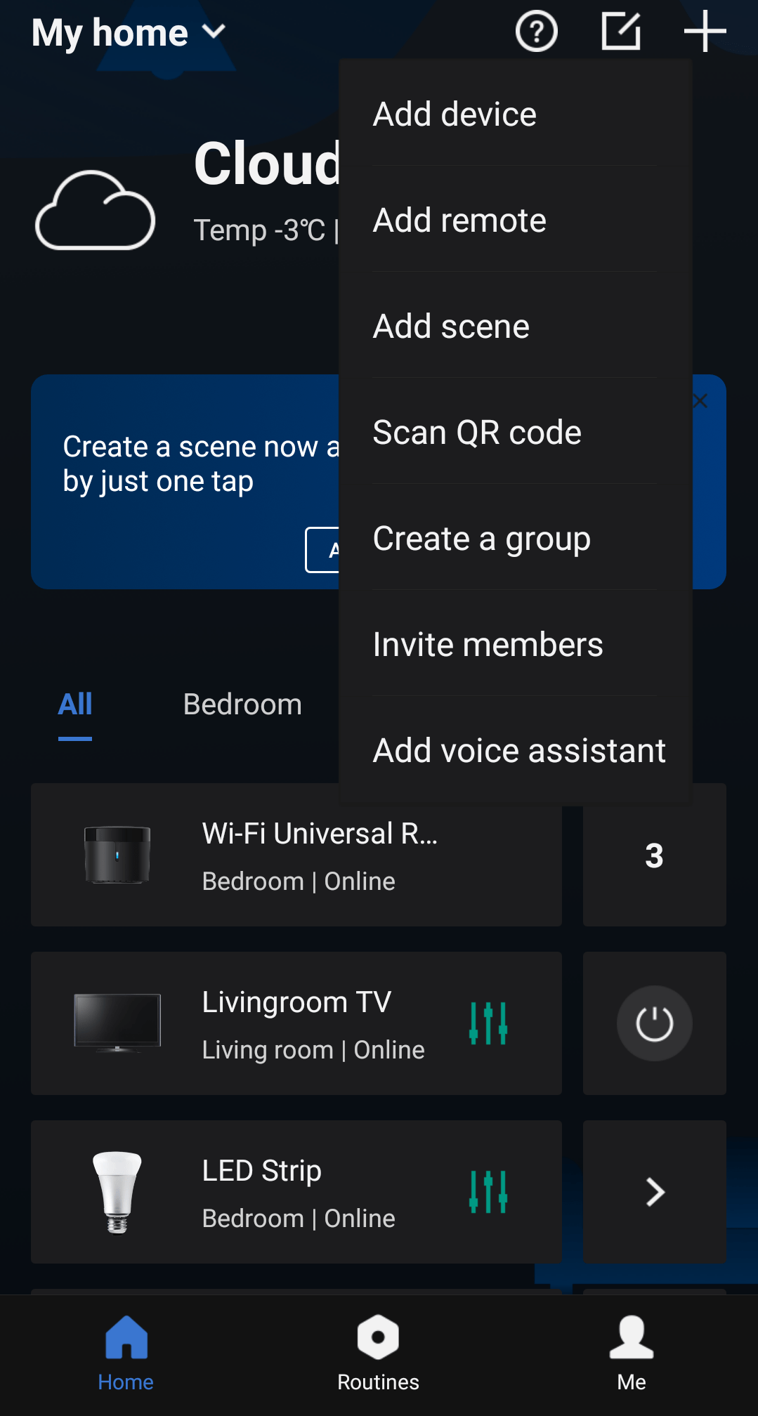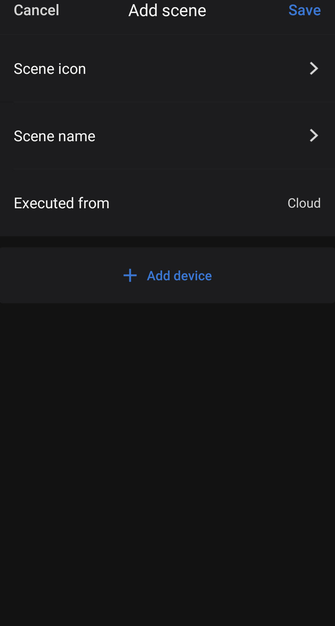 Pentru a adăuga un nou scenariu apăsați pe plusul din dreapta sus -> ”Add scene” -> selectați General Scene și adăugați toate informațiile cerute icon, nume scenă și execuție din Cloud).