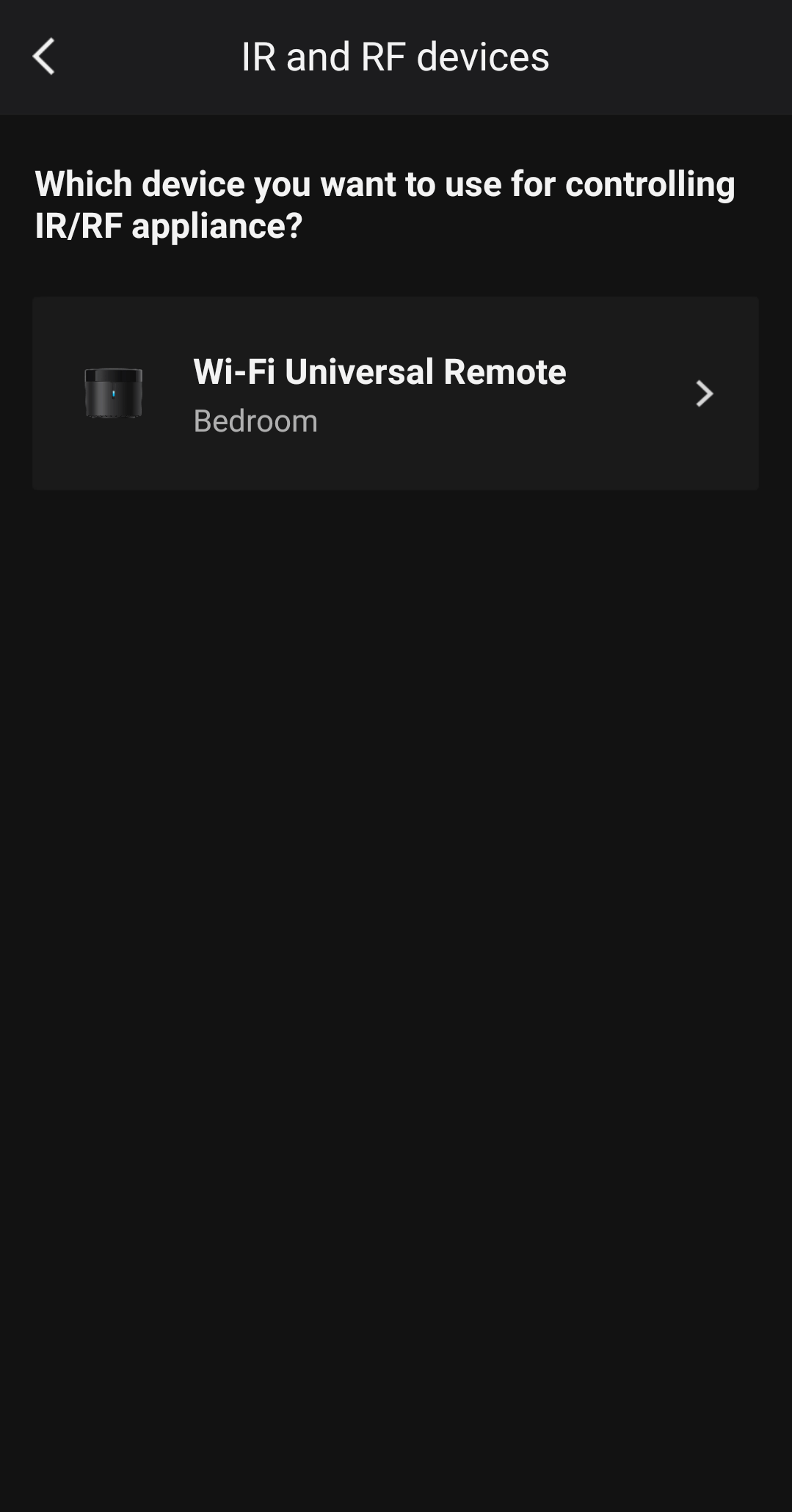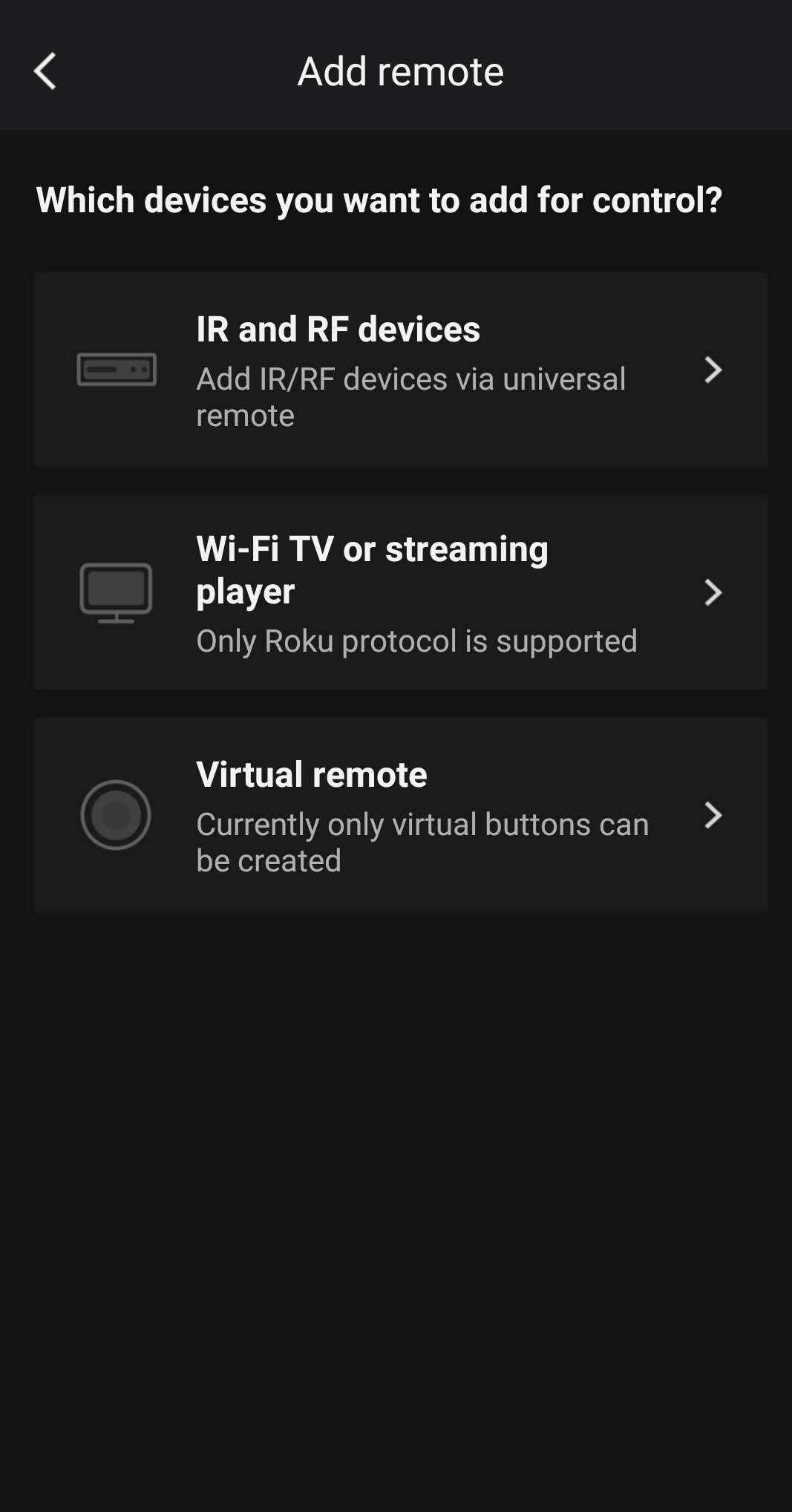 Pentru a adăuga un nou dispozitiv apăsați pe plusul din dreapta sus și selectați ”Add Remote”, apoi selectați hub-ul în care vreți să adăugați telecomanda. Având unul singur, l-am selectat pe acesta. Iar la următorul pas trebuie să selectați tipul telecomenzii. Eu am testat doar telecomenzi IR (infraroșu) și RF (radiofrecvență). Dar dacă aveți un dispozitiv Roku, îl veți putea controla cu hub-ul Broadlink RM4 Mini.